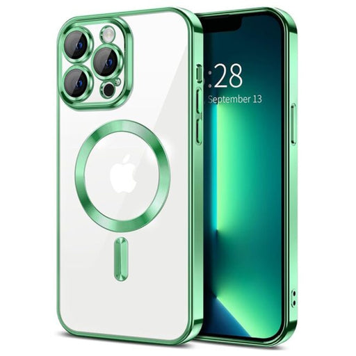 Vezi detalii completeHusa iPhone 14 Po Max Transparenta Cu Margini Colorate Magsafe, Protectie Camera, Verde Lucios