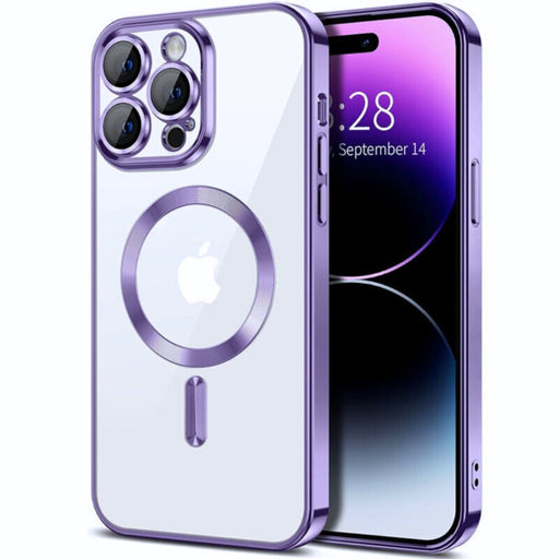 Husa iPhone 14 Po Max Transparenta Cu Margini Colorate Magsafe, Protectie Camera, Mov Lucios