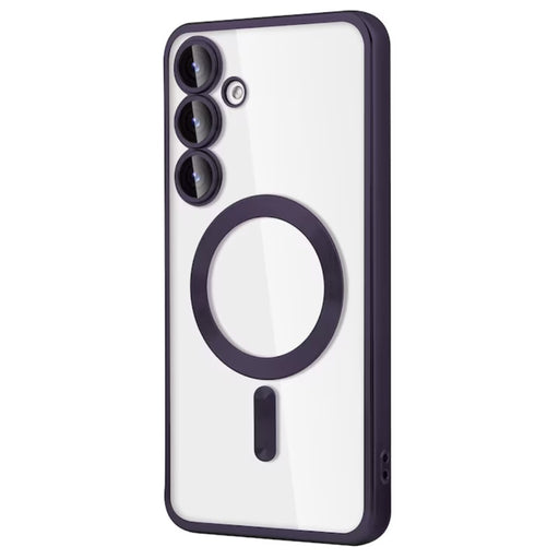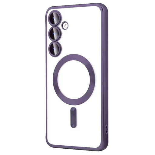 Descoperă husa transparentă pentru Samsung S23 FE, cu margini colorate MagSafe și protecție pentru cameră, în nuanța vibrantă mov – alegerea perfe...