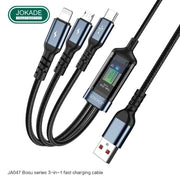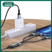 Cablu multifuncțional JOKADE JA047 cu lungime de 1,2 metri, ideal pentru încărcare și sincronizare rapidă. Are trei capete diferite, compatibile cu o varietate de dispozitive – smartphone-uri, tablete, gadgeturi — oferind versatilitate și conveniență.